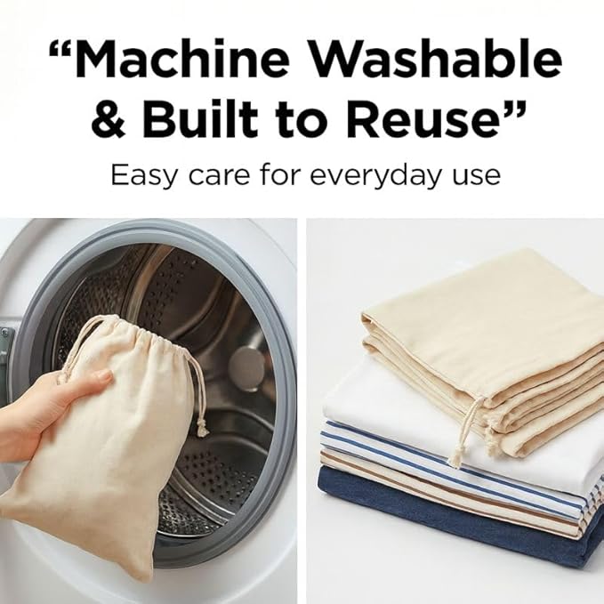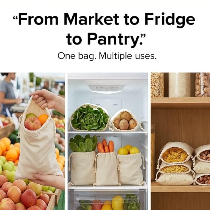 - Breathable 100% Cotton for Fresh Produce-Made from natural cotton fabric that allows airflow, helping reduce moisture and keep fruits and vegetables fresh for longer than plastic storage.