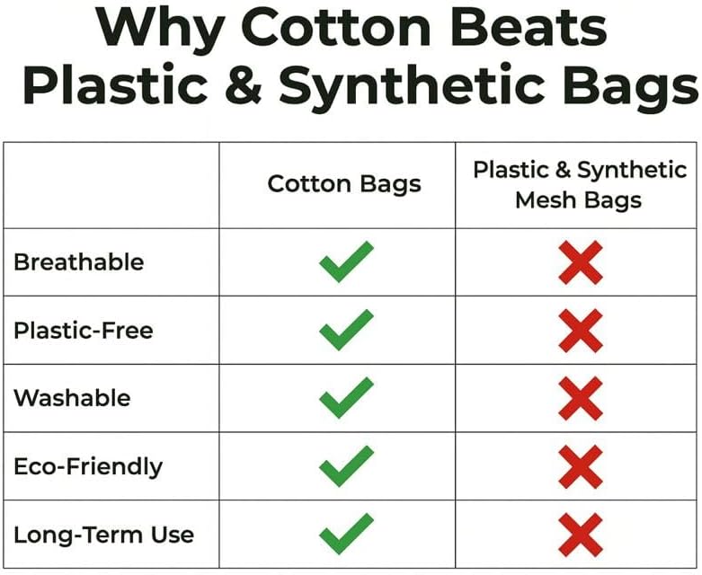 100% Cotton Reusable Vegetable Storage Bags Pack of 3 | Fridge & Kitchen Produce Bags with Drawstring | Eco-Friendly Fruit & Vegetable Storage Bags (1 Large, 1 Medium, 1 Small)