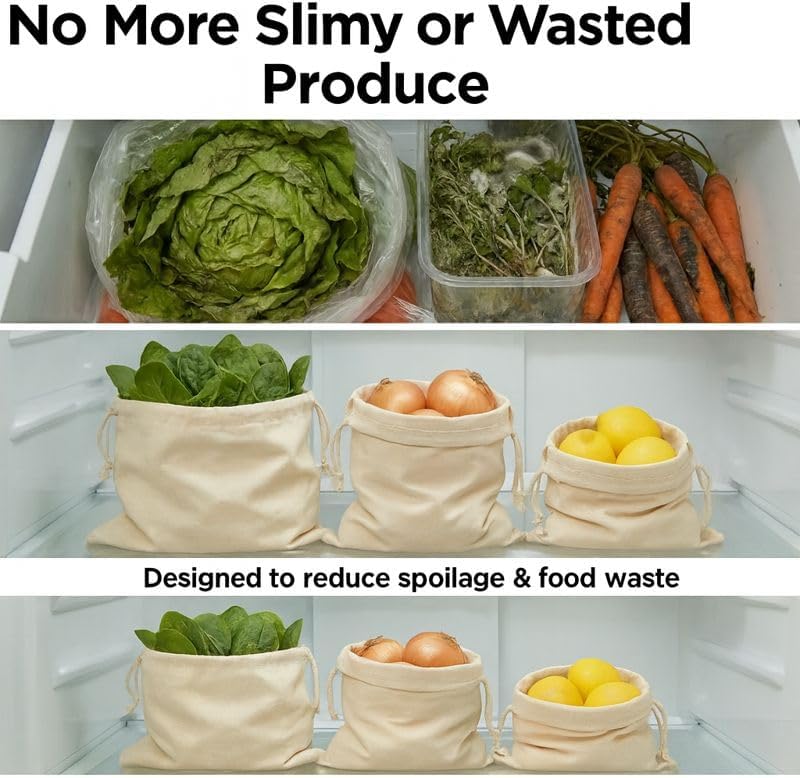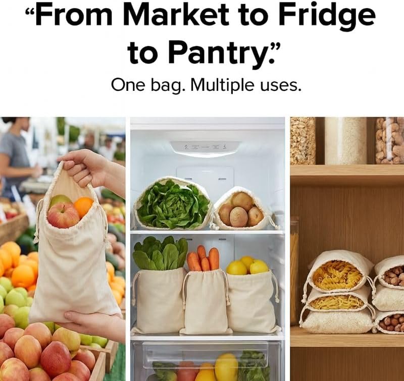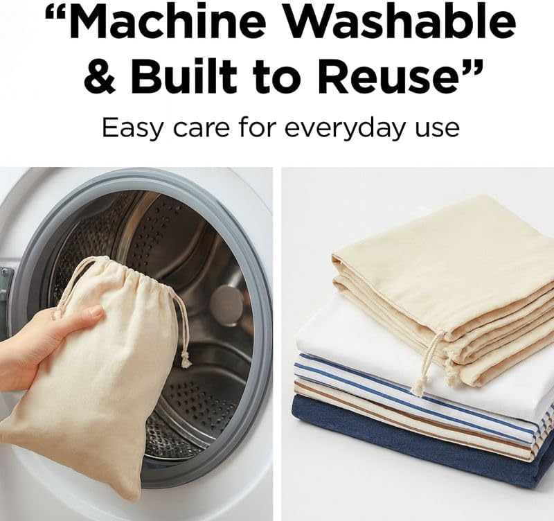 - Reusable, Washable & Plastic-Free Designed for daily reuse. These cotton storage bags are machine washable, eco-friendly, and a sustainable alternative to disposable plastic produce and bread bags.