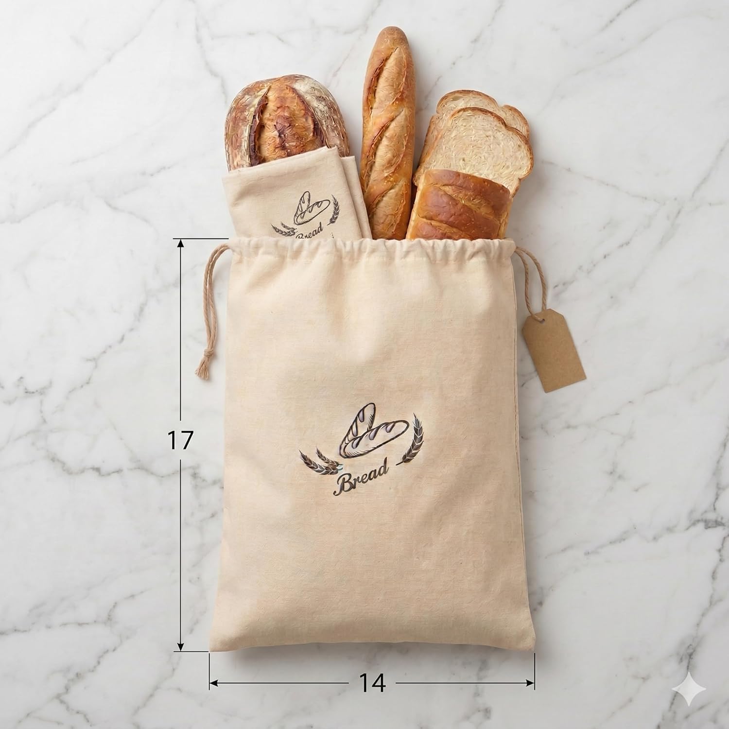 - Large 14×17 inch bread bags fit sourdough boules, sandwich loaves, baguettes, and homemade bread. Includes 2 reusable cotton bread bags ideal for home bakers, sourdough enthusiasts, and bakery storage.